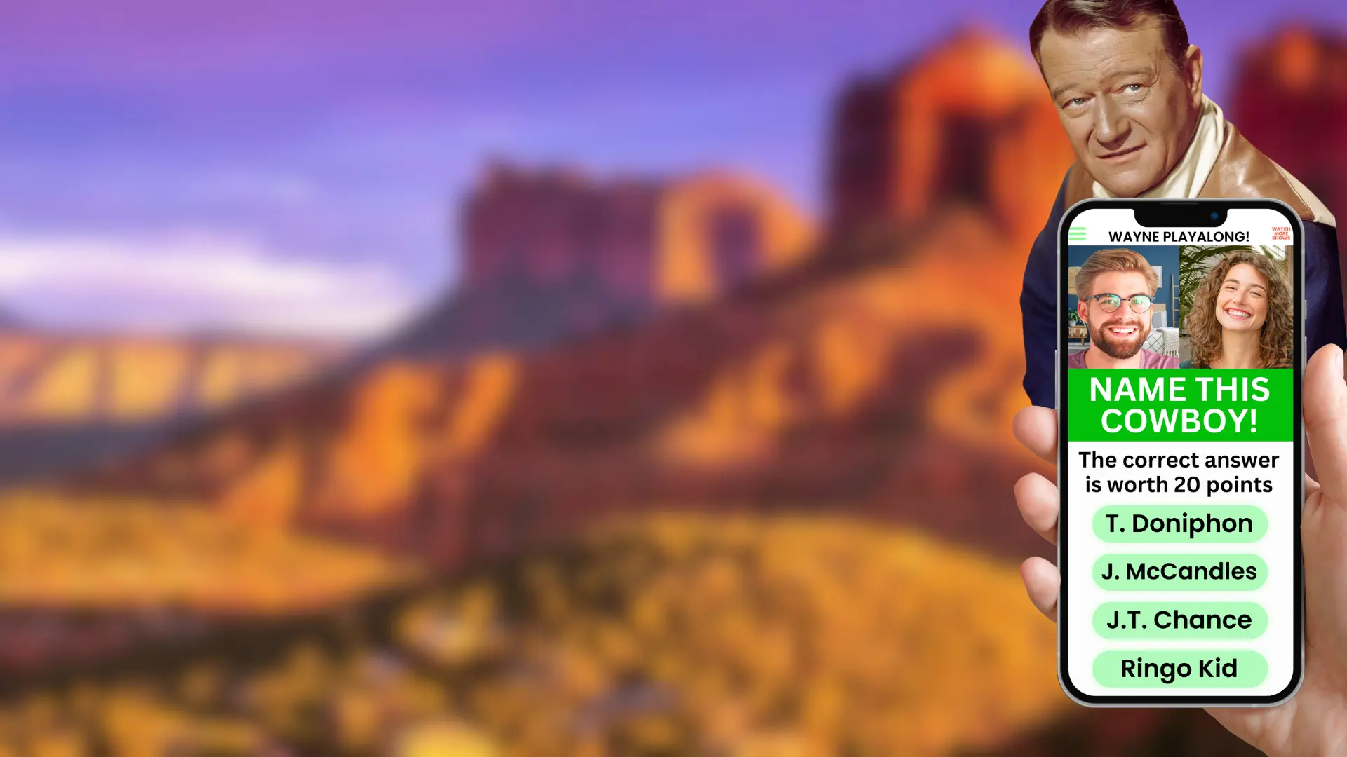 Play free mini-games with friends, while you watch John Wayne movies, streaming now! Test your TV and movie trivia knowledge with entertaining online games synced to 'Stagecoach,' 'Big Jake,' and more - try a new trivia game every day! Play games created for Amazon Prime Video movies, YouTube TV movies, Netflix originals, and HBO Max free episodes. Join the fun from your PC or phone, and play multiplayer games with friends through an in-person Party Game or our in-game virtual watch party. Rack up points from a wide variety of mini-games - multiple choice trivia, audience polls, guessing games, and more - to climb our Internet-wide leaderboard. Why just watch, when you can Play Along?